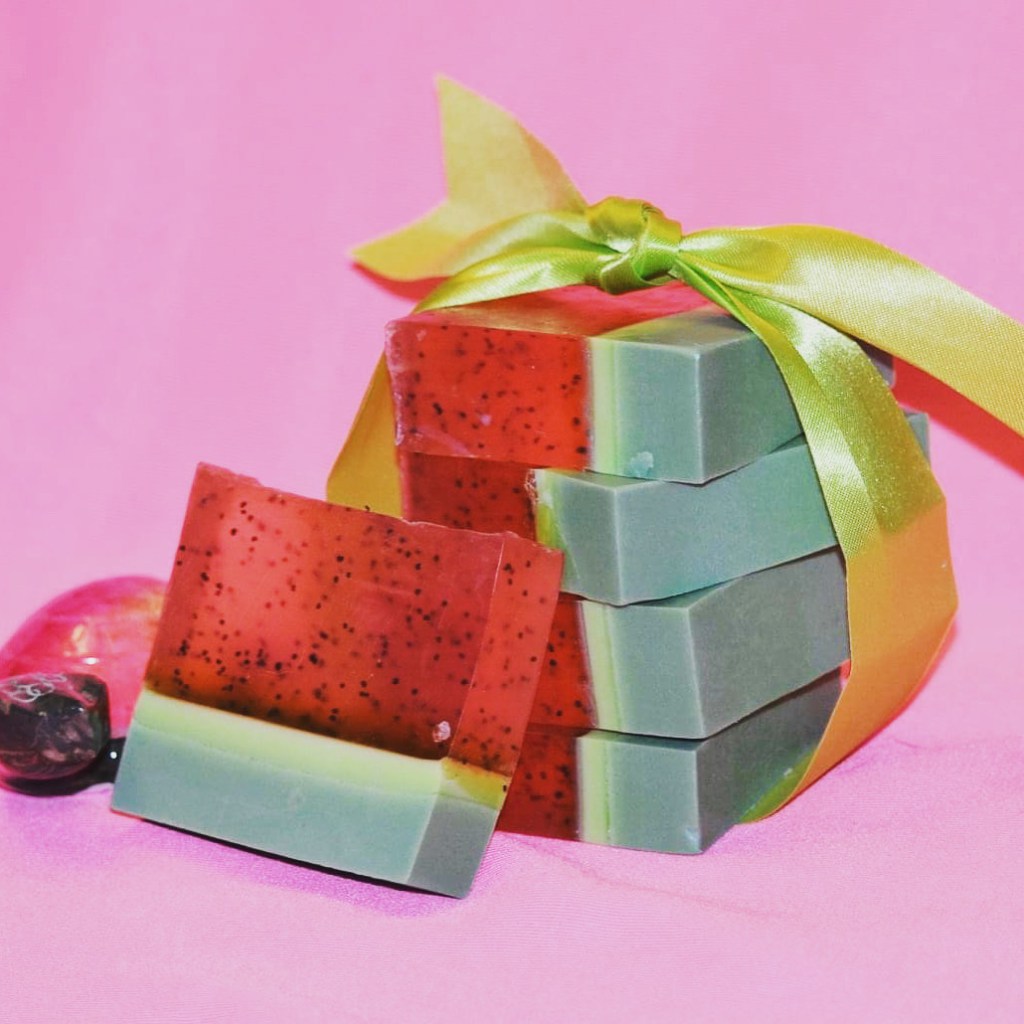 Made from goat’s milk and clear glycerin with a light watermelon smell, these soaps are super cute and an adorable gift!